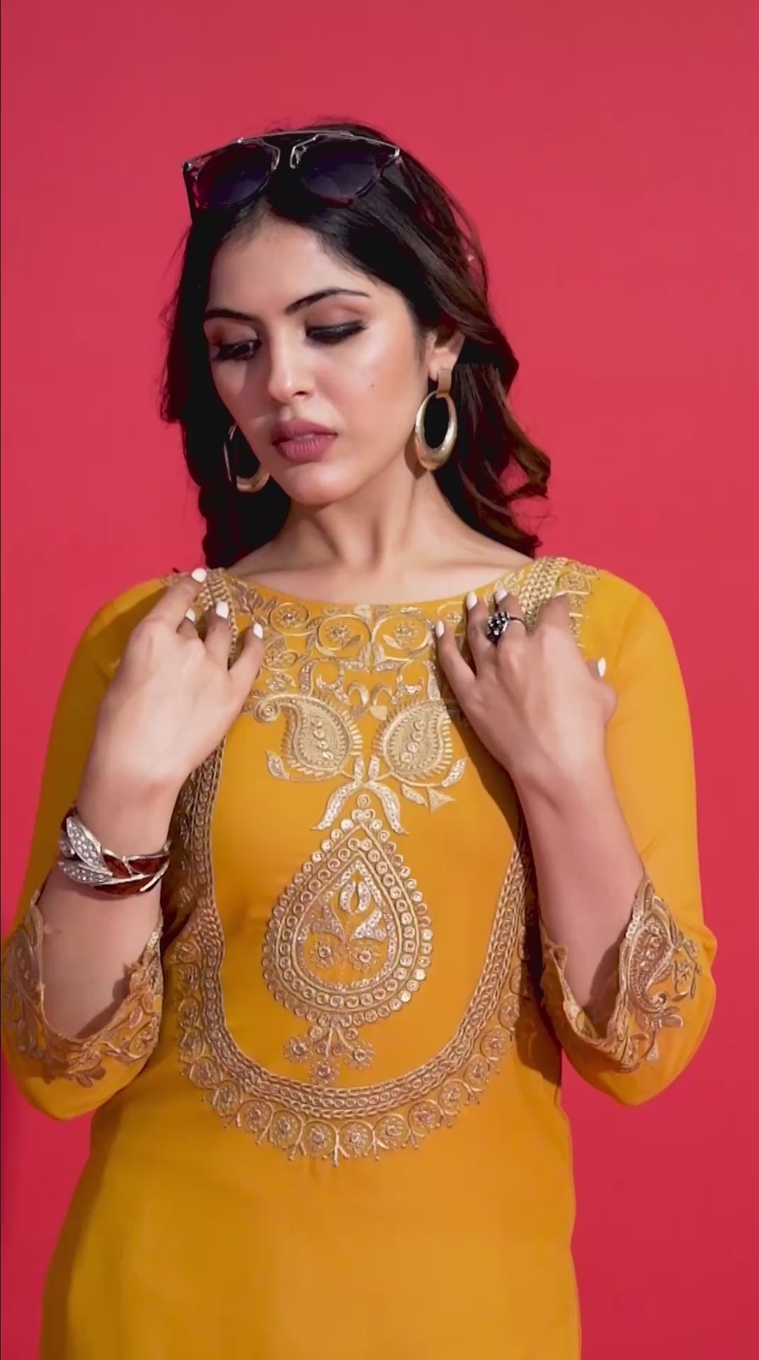 Brighten up your ethnic wardrobe with this radiant mustard yellow sharara suit featuring delicate golden embroidery. Designed with a short kurti, heavily flared sharara, and a scalloped dupatta, this ensemble is a perfect pick for haldi functions, mehndi nights, festive occasions, and wedding parties.