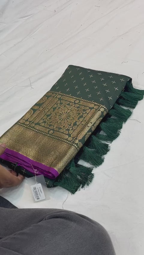 Discover elegance in tradition with this stunning Soft Silk Saree designed with double zari chex weaving throughout the body. The saree is beautifully complemented by a rich weaving zari border and a luxurious rich pallu, making it an ideal choice for weddings, festive occasions, or special traditional events. Its smooth, soft silk texture offers comfort, while the intricate craftsmanship ensures you stand out in every gathering.