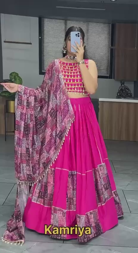 rani pink lehenga choli, mirror work chaniya choli, navratri lehenga with dupatta, block print dupatta lehenga, festive mirror work outfit, designer garba dress 2025, ethnic lehenga for women, pink lehenga with tassel blouse, traditional mirror work choli, navratri chaniya choli online